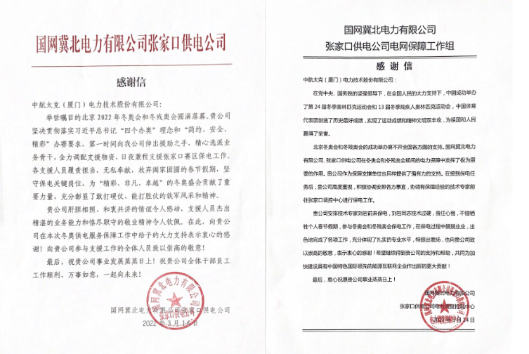 中航太克圆满完成冬奥会、冬残奥会电力系统保障工作,获得了国网冀北电力有限公司张家口供电公司和保障组的充分认可和感谢,充分彰显了全方位优质服务,为行业树立服务新标杆。