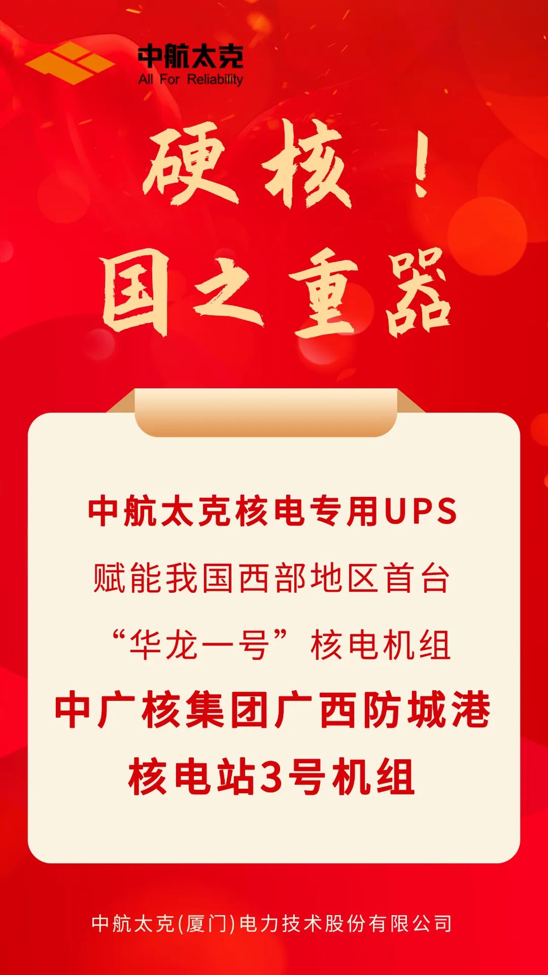 作为先进的新型数字电力能源系统制造商,中航太克将持续深耕核电细分领域,攻关核电UPS关键技术,并严格按照《民用核安全设备监督管理条例》(国务院令第500号)、《民用核安全设备设计制造安装和无损检验监督管理规定》(HAF601)等法律法规以及核电产品相关标准和质保大纲的要求,对产品质量进行严格管控,为用户提供可靠产品与服务,为我国自主研发核电事业做出更大贡献。