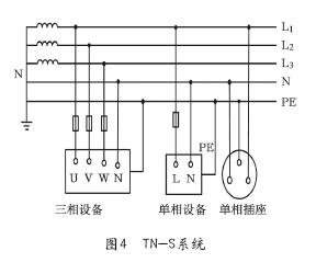 TN-S系统中性线N与TN系统相同,并且用电设备外露可导电部分通过PE线连接到电源中性点,与系统中性点共用接地体,而不是连接到自己专用的接地体,中性线(N线)和保护线(PE线)是分开的。TN-S系统的最大特征是N线与PE线在系统中性点分开后,不能再有任何电气连接,这一条件一旦破坏,TN-S系统便不再成立,详见图4。