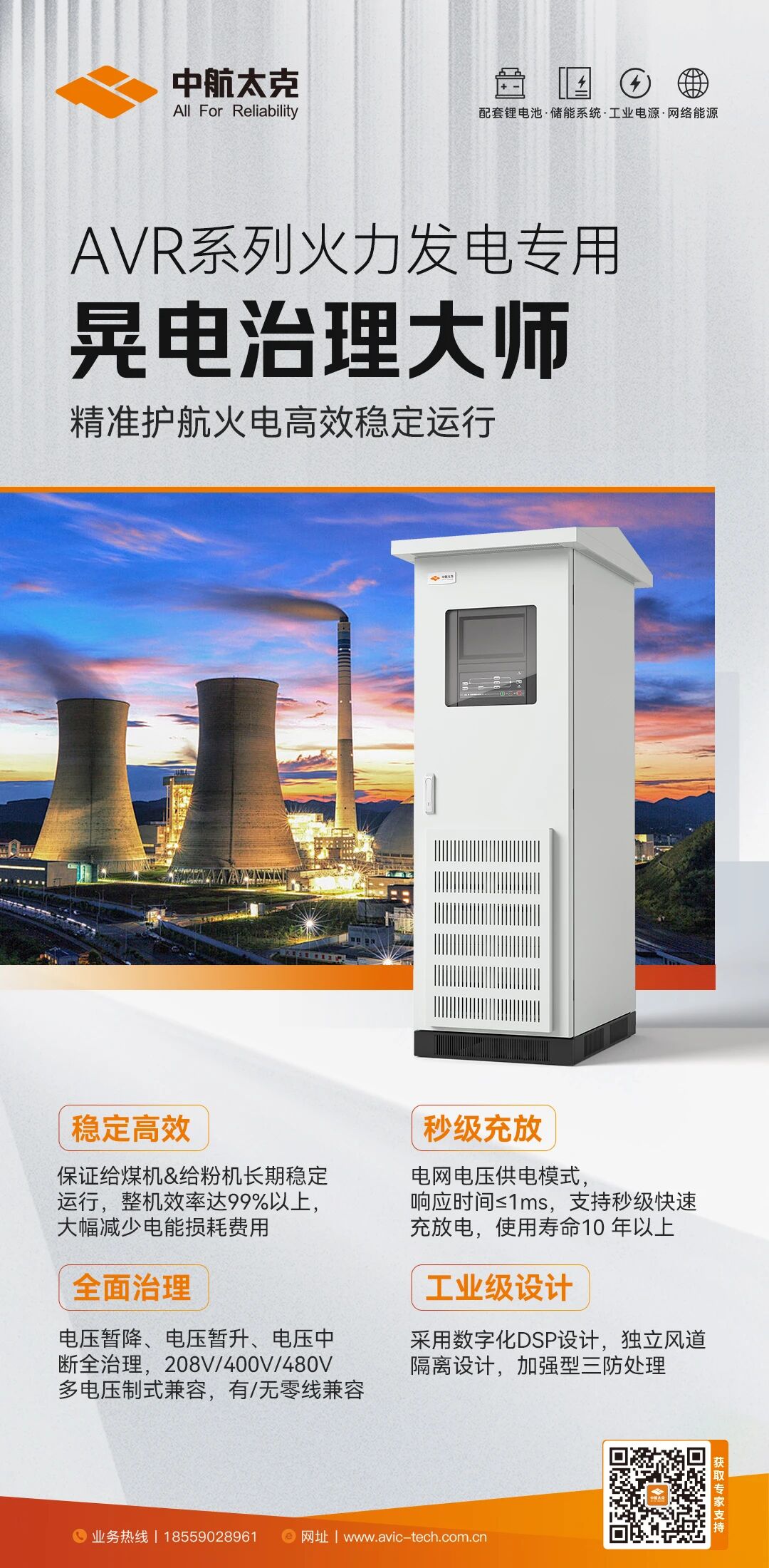 该项目中应用的主要设备“晃电治理大师”——AVR系列火力发电专用动态电压恢复器,以高效、节能、稳定、可靠的特点,有效治理电压暂降、暂升、短时中断等晃电问题,保证给煤机和给粉机持续稳定运行。