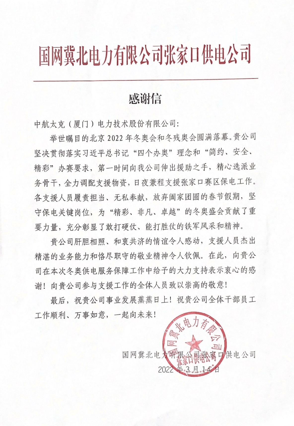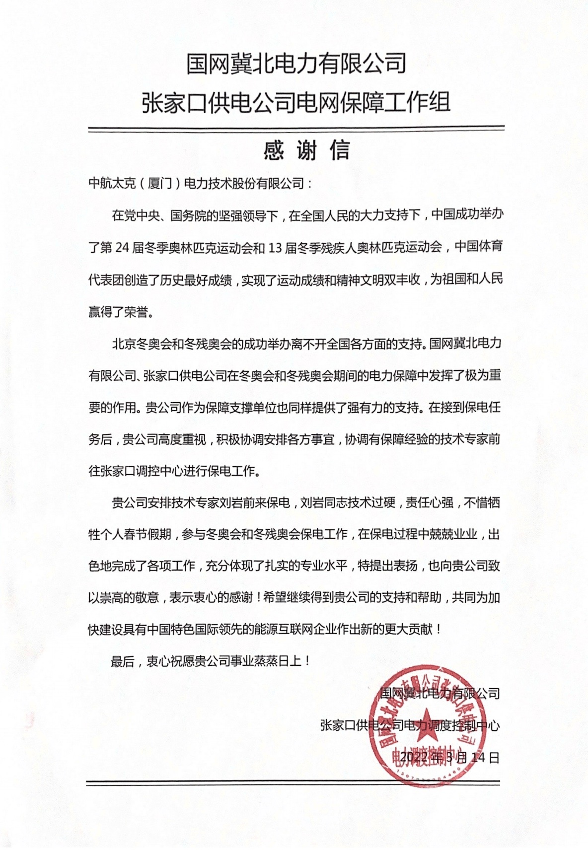 The whole process, full cycle and multi-dimensional team of AVIC Tec provided strong power guarantee support for the "wonderful, extraordinary and excellent" Winter Olympic Games, which was fully recognized and thanked by the Zhangjiakou power supply company and the support group of the State Grid Jibei Power Co., Ltd., fully demonstrated the all-round high-quality service and set a new benchmark for the industry.