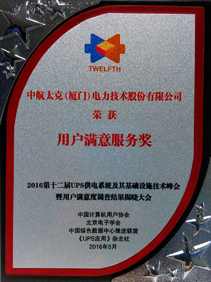 On May 20, 2016, avic-tec (Xiamen) Power Technology Co., Ltd. won the "user satisfaction service award" in the ups user satisfaction survey at the "2016 12th UPS power supply system and infrastructure technology summit and user satisfaction survey results disclosure conference" with the theme of "vitality, innovation, integration and development".